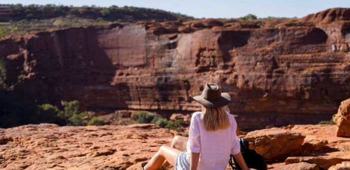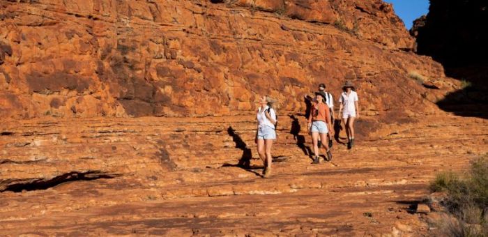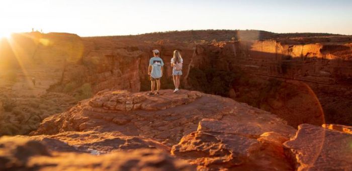 Today we have some distance to cover. Travel north, past the Dingo Fence and the Aboriginal Heritage site, The Kanku-Breakaways Conservation Park, where you will be mesmerised by the scenery of the Moon Plains. Then, crossing into the Northern Territory, travel onwards to Watarrka National Park, the site of Kings Canyon. Come late afternoon, arrive at our campsite at the Kings Creek Station. Relax, soak up the serenity, and, on warmer days, enjoy a swim in the pool. Have your camera ready for a stunning desert sunset from the sunset viewing platform before dinner at the Station restaurant eatery and settling in for the night. Today, we drive approximately 770km. Accommodation Swag camping at Kings Creek Station